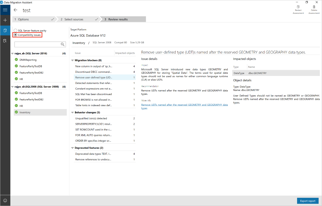 Revise los problemas de compatibilidad en todos los niveles de compatibilidad admitidos por la versión de SQL Server de destino seleccionada en la página Opciones.