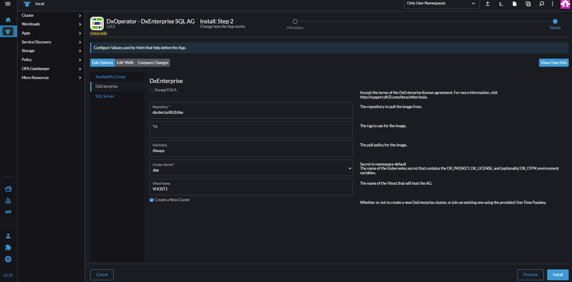 DxOperator es una extensión de software para Kubernetes que usa definiciones de recursos personalizadas para automatizar la implementación de clústeres de DxEnterprise. DxEnterprise proporciona toda la instrumentación necesaria para crear, configurar, administrar y proporcionar conmutación automática por error para las cargas de trabajo de los grupos de disponibilidad (AG) de SQL Server en Kubernetes. Puede registrarse para obtener una licencia gratuita de software dxEnterprise. Para obtener más información, consulte la Guía de inicio rápido de DxOperator. Para problemas de soporte técnico, póngase en contacto directamente con SUSE.