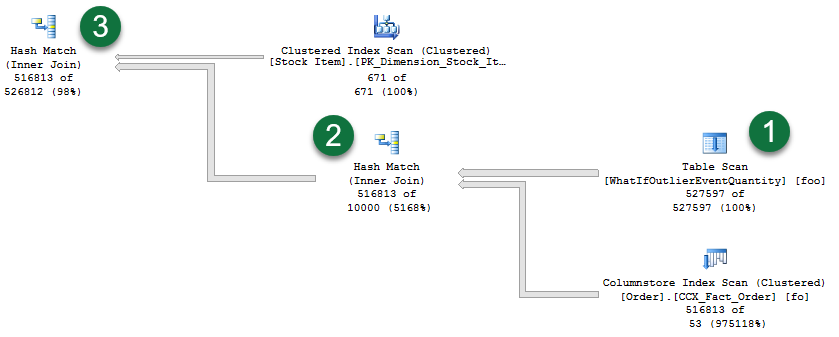 - El recorrido de tabla de MSTVF tiene una estimación fija de 100 filas. Pero en este ejemplo hay 527.597 filas que pasan por este recorrido de tabla de MSTVF, como se muestra en las estadísticas de consultas dinámicas a través de 527597 de 100 reales de estimados, por lo que la estimación fija está considerablemente desviada.