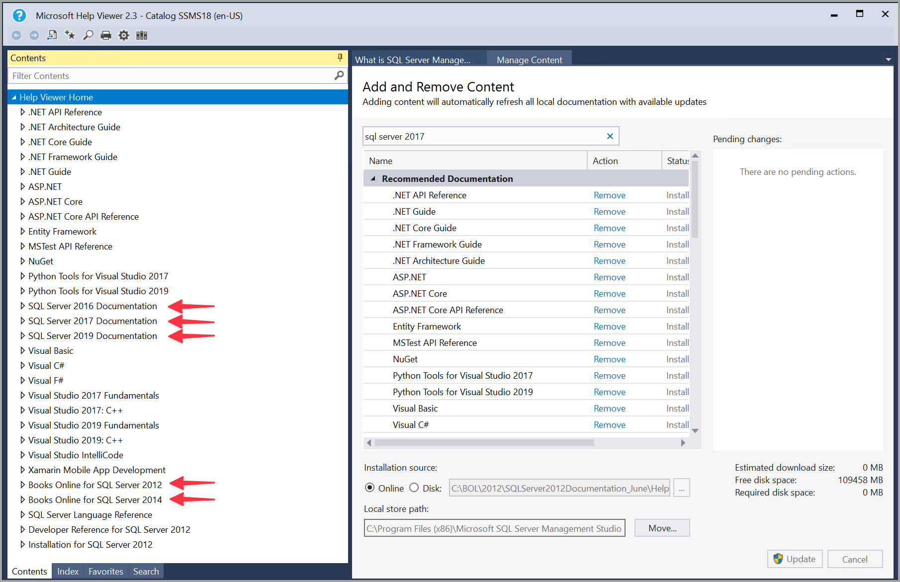 Para encontrar el contenido de Ayuda más reciente de SQL Server 2016 (13.x) y versiones posteriores, en la pestaña Administrar contenido, elija En línea en el origen de la instalación y, después, escriba sql server en la barra de búsqueda.