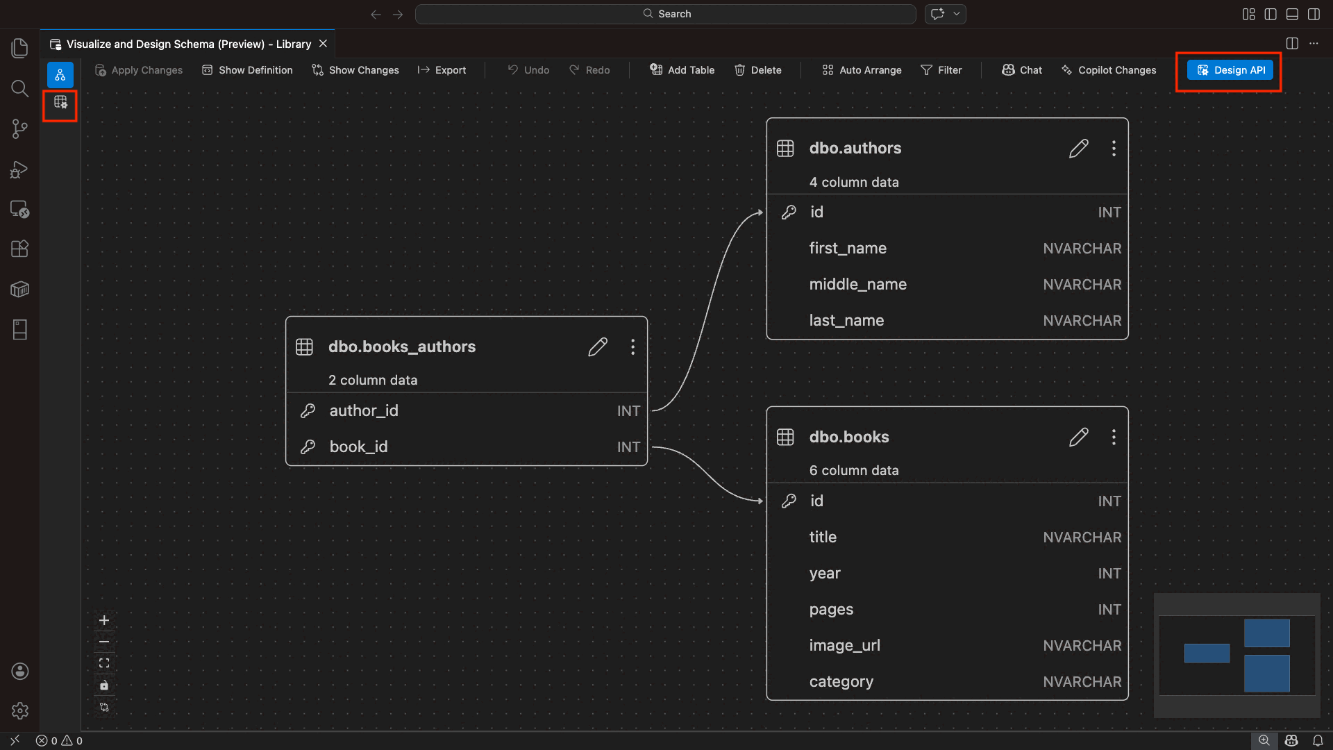 En el Diseñador de esquemas: seleccione el botón Diseñar API (botón en la esquina superior derecha de la barra de herramientas) o seleccione el icono Back-end en el panel izquierdo.