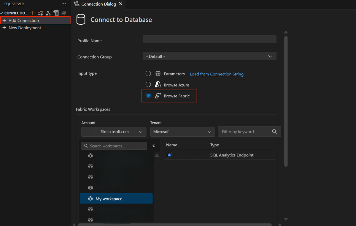 Use la experiencia de exploración de Fabric en la extensión MSSQL para conectarse a la base de datos SQL en puntos de conexión de Fabric o SQL Analytics sin copiar manualmente cadenas de conexión desde el portal de Fabric.