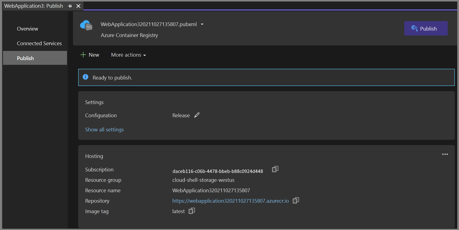 Con Visual Studio, puede compilar, depurar y ejecutar aplicaciones .NET en contenedor, ASP.NET y ASP.NET Core y publicarlas en Azure Container Registry, Docker Hub, Azure App Service o su propio Container Registry. En este artículo, publicará una aplicación de ASP.NET Core en el Azure Container Registry.