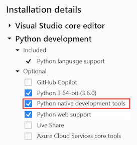 Al instalar la carga de trabajo Ciencia de datos y aplicaciones analíticas , python y la opción herramientas de desarrollo nativas de Python se instalan de forma predeterminada.