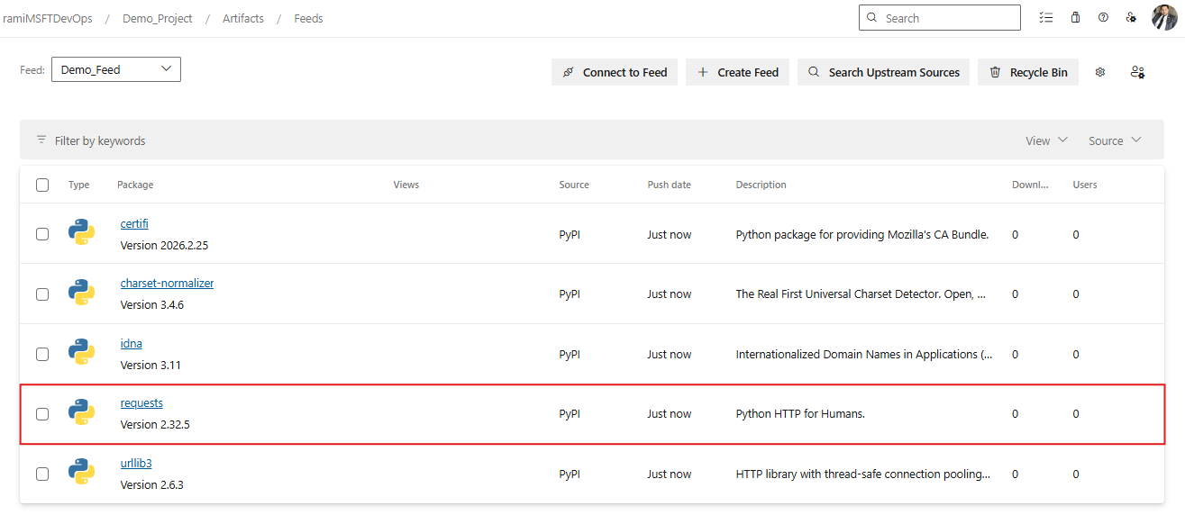 pip install requestsUna vez completada la instalación, Azure Artifacts guarda una copia del paquete en tu flujo. Acceda a su feed para verificar que el paquete esté disponible, como se muestra en la captura de pantalla siguiente.