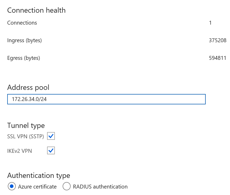 Si vous utilisez une connexion VPN point à site, accédez à la configuration dans le portail Azure pour voir si les sections Entrée/Sortie contiennent des chiffres. La présence de chiffres autres que zéro indiquent qu’Azure achemine le trafic entrant et sortant sur l’ordinateur local.