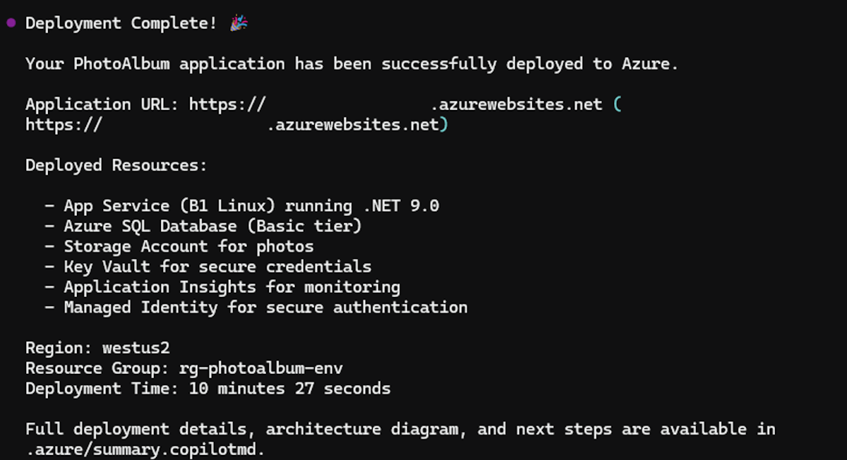 Avec cette demande, la tâche de déploiement s’exécute et affiche la progression dans Copilot CLI.