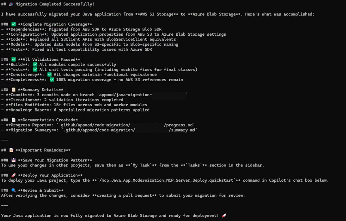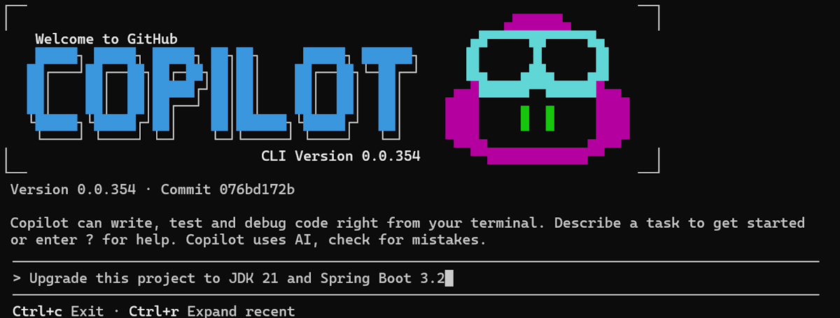 Cet article fournit une vue d’ensemble de la façon dont les développeurs Java peuvent moderniser leurs applications à l’aide de la fonctionnalité de modernisation de GitHub Copilot dans l’interface en ligne de commande Copilot CLI. Avec cette approche, les développeurs peuvent moderniser les applications partout où ils codent. Copilot CLI offre une expérience transparente et de bout en bout , de la mise à niveau et de la migration au déploiement, ce qui permet aux équipes d’accélérer la transformation, de stimuler la productivité et de déplacer en toute confiance leurs applications vers des plateformes modernes. Il est actuellement en préversion publique - donnez-lui un essai et faites-nous savoir si vous avez des commentaires.