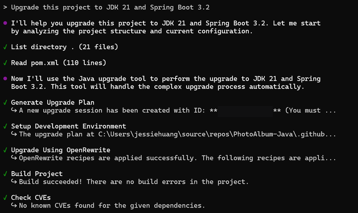 La tâche de modernisation s’exécute ensuite, notamment la génération du plan de mise à niveau, l’exécution de la correction du code, la génération du projet et la vérification des vulnérabilités, comme illustré dans la capture d’écran suivante :