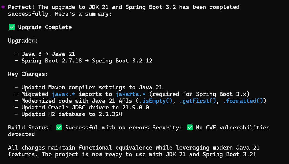 Le projet est correctement mis à niveau vers JDK 21 et Spring Boot 3.2, et un résumé de la mise à niveau s’affiche.