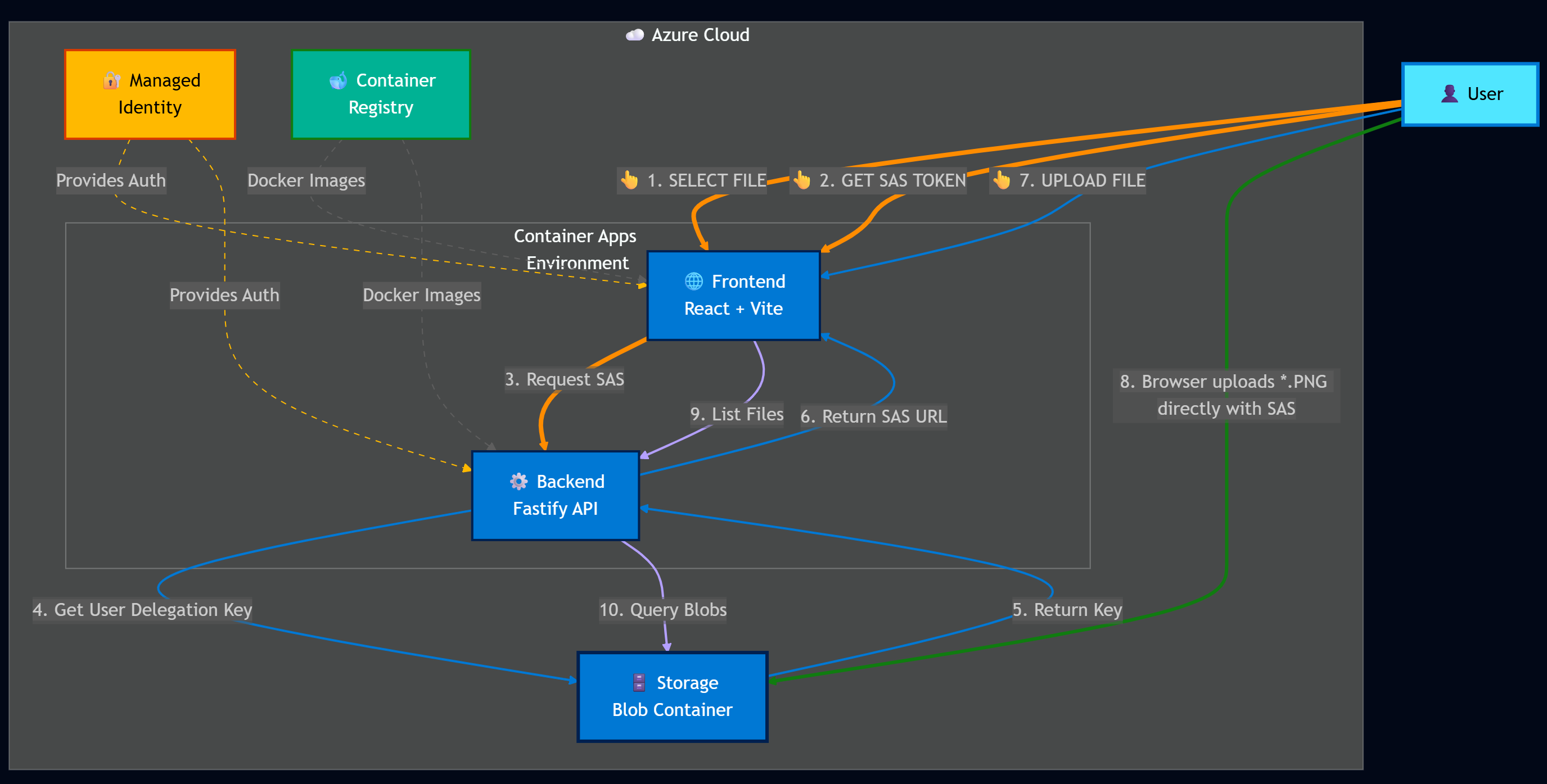 À la fin de ce tutoriel, vous disposez d’une application opérationnelle déployée sur Azure Container Apps qui illustre les chargements de fichiers sécurisés sans exposer les informations d’identification de stockage au navigateur.