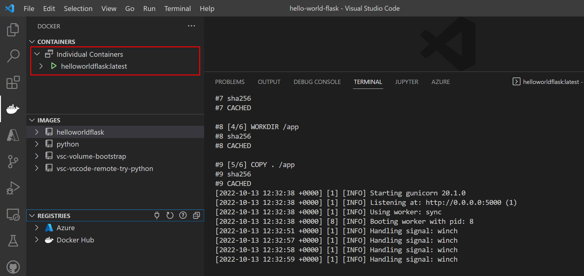 Vous pouvez également utiliser des images et des conteneurs Docker Python à l’aide d’Azure CLI et de Docker CLI. VS Code et PyCharm ont des terminaux dans lesquels vous pouvez exécuter ces CLIs.