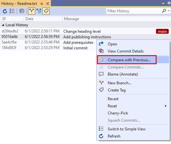 Visual Studio 2019 et versions antérieures ne prennent pas en charge la comparaison des branches. Par conséquent, si vous utilisez l’une de ces versions, vous pouvez comparer des branches sur la ligne de commande Git ou à l’aide de votre navigateur web , si votre dépôt est hébergé dans Azure Repos ou GitHub. Visual Studio 2022 prend en charge la comparaison des branches, comme décrit dans Comparer des branches.