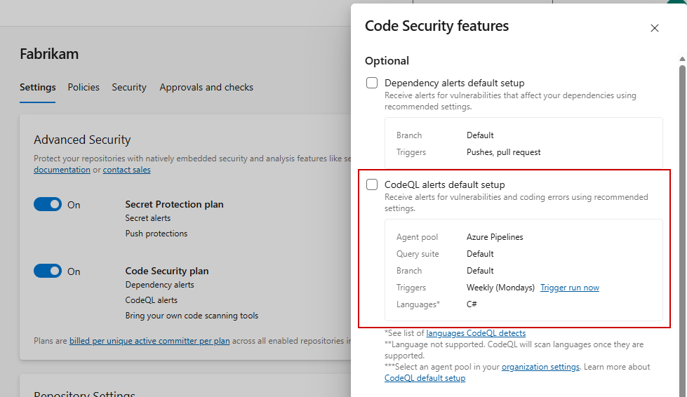 La configuration par défaut est le moyen le plus rapide d’activer l’analyse du code. Le programme d’installation par défaut s’exécute selon une planification à l’aide de Azure Pipelines, détecte les langages pris en charge par CodeQL dans votre référentiel et configure automatiquement l’analyse. Si les langues de votre référentiel changent, la configuration de l’analyse est mise à jour automatiquement.