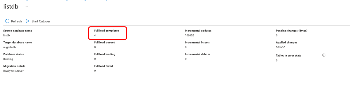 Lorsque la migration est terminée, sous Nom de la base de données, sélectionnez une base de données spécifique pour obtenir l’état de migration des opérations Full data load (Charge complète des données) et Incremental data sync (Synchronisation incrémentielle des données).