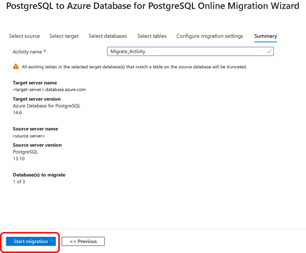 Dans l’écran Récapitulatif de la migration pour la zone de texte Nom de l’activité, spécifiez un nom pour l’activité de migration, puis examinez le résumé pour vérifier que les détails de la source et de la cible correspondent à ceux spécifiés précédemment.