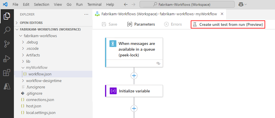 Ce guide montre comment créer une définition de test unitaire à partir d’un flux de travail. Cette définition simule les appels externes de chaque opération de flux de travail sans modifier la logique du flux de travail. Lorsque vous créez un test unitaire pour un flux de travail, vous obtenez un projet de test unitaire qui inclut les dossiers suivants :