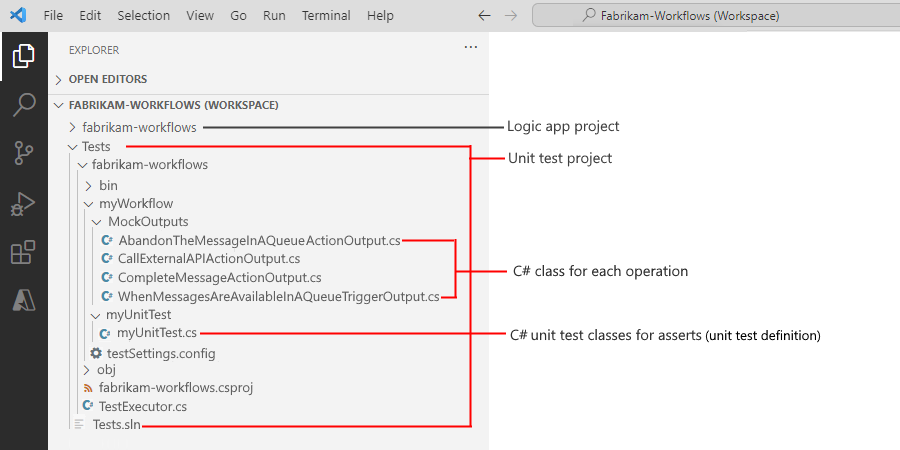 Dossier pour chaque définition de test unitaire. Ce dossier inclut un fichier C# qui contient un exemple de classe et de méthodes. Vous utilisez cette classe et ces méthodes pour configurer vos propres assertions, vérifiez que le flux de travail se comporte comme prévu et assurez-vous que le flux de travail se comporte de manière fiable et prévisible dans votre plus grand écosystème Azure.