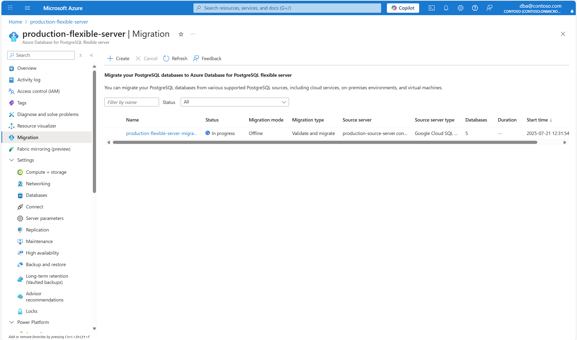 Une fois que vous avez sélectionné le bouton Démarrer la validation et la migration , une notification s’affiche, en quelques secondes, pour indiquer que la création de la validation ou de la migration réussit. Vous êtes automatiquement redirigé vers la page Migration du serveur flexible. L’entrée affiche l’état comme en cours. Le flux de travail prend 2 à 3 minutes pour configurer l’infrastructure de migration et vérifier les connexions réseau.