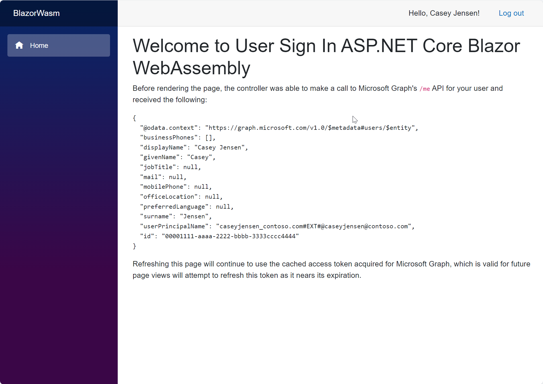 La capture d’écran suivante s’affiche, indiquant que vous êtes connecté à l’application et que vous avez accédé aux détails de votre profil à partir de l’API Microsoft Graph.