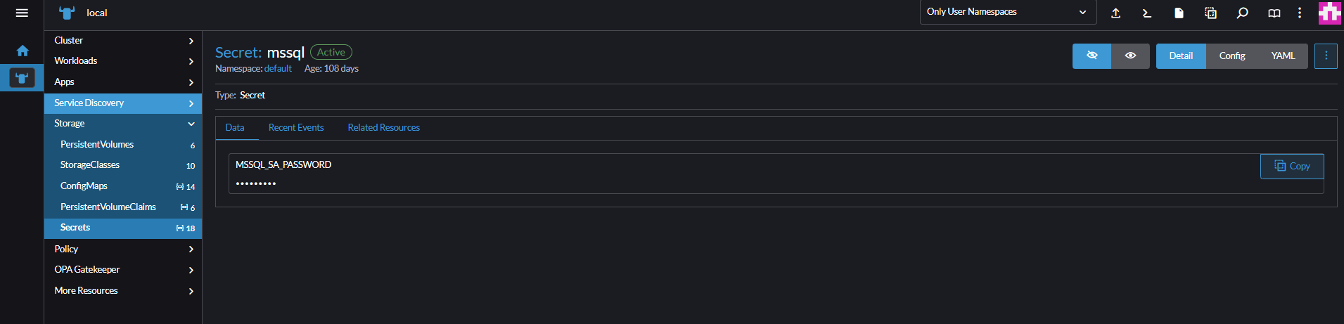 mssql, définissez le nom de la clé commeMSSQL_SA_PASSWORDavec la valeur d’un mot de passe fortsa.Sélectionnez Créer pour terminer la création du secret.