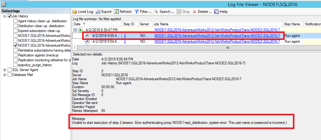 Error messages: Agent 'NODE1\SQL2016-AdventureWorks2022-AdvWorksProductTrans-NODE2\SQL2016-7' is retrying after an error. 89 retries attempted. See agent job history in the Jobs folder for more details.L’erreur indique que l’Agent de distribution fait une nouvelle tentative. Pour trouver plus d’informations, consultez l’historique de l’Agent de Distribution :