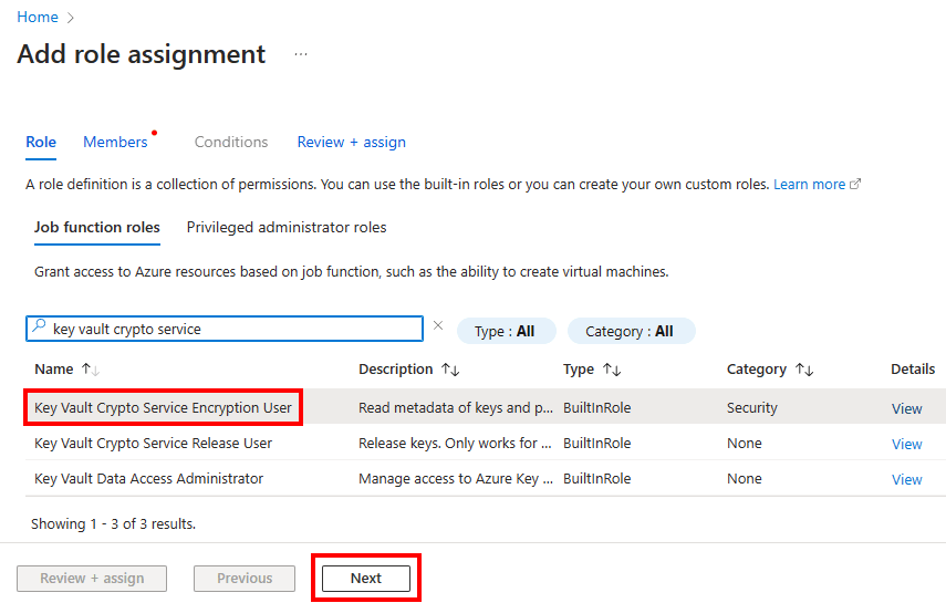 L’application EKM a besoin du rôle Utilisateur du service de chiffrement de Key Vault pour effectuer les opérations d’enveloppement et de désenveloppement. Rechercher Utilisateur du service de chiffrement Key Vault et sélectionnez le rôle. Cliquez sur Suivant.