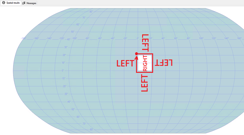 L’intérieur du polygone dans un système ellipsoïdal est défini par la « règle de gauche » : si vous vous imaginez en train de longer l’anneau formé par un polygone geography en suivant les points dans l’ordre dans lequel ils sont listés, la zone de gauche est considérée comme l’intérieur du polygone et la zone de droite comme l’extérieur.