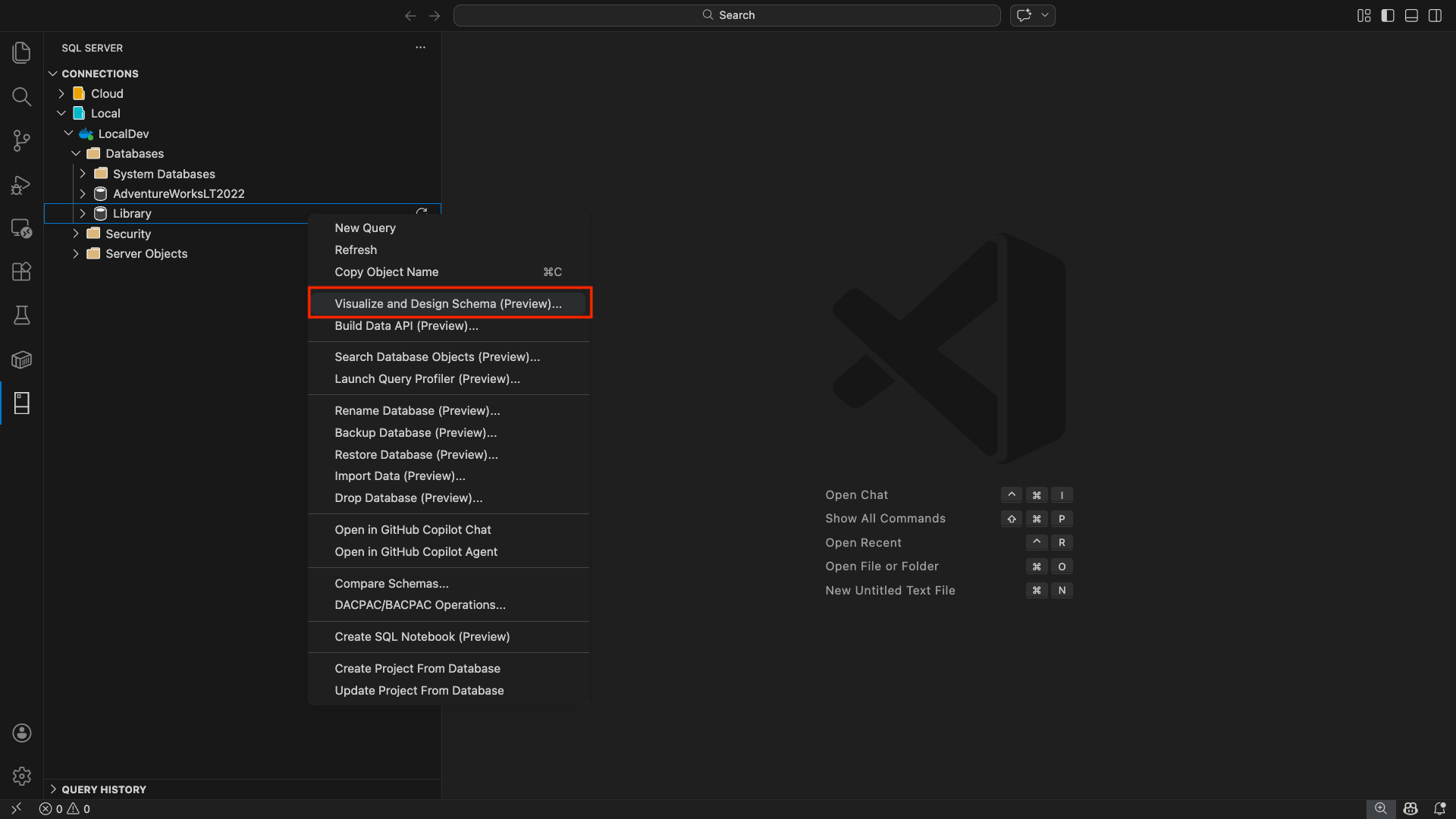 Vous pouvez également cliquer avec le bouton droit sur un nœud de base de données et sélectionner Ouvrir en mode Agent Copilot pour démarrer une session de conversation de l’agent Copilot GitHub. En mode agent, vous pouvez demander à GitHub Copilot d’ouvrir le Concepteur de schémas pour vous, par exemple : "Open schema designer for AdventureWorksLT2022". Pour plus d’informations, consultez Démarrage rapide : Utiliser le mode agent Copilot GitHub.