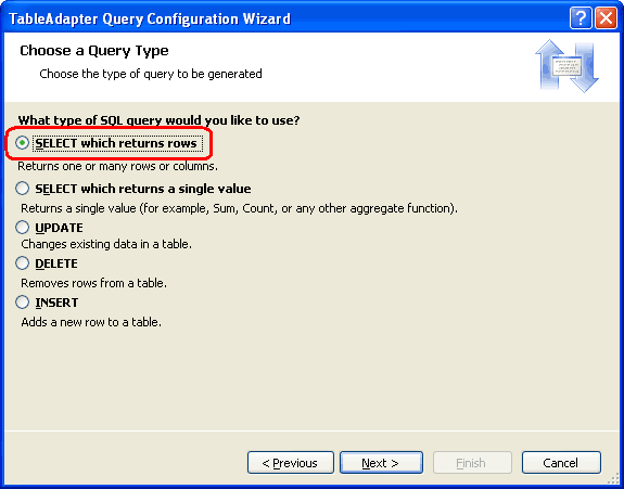 Nella schermata successiva, illustrata nella Figura 4, la procedura guidata ci chiede che tipo di query aggiungere. Poiché il GetProductsWithPriceQuartile metodo restituirà tutte le colonne e i record della Products tabella, selezionare l'opzione SELECT che restituisce le righe e fare clic su Avanti.