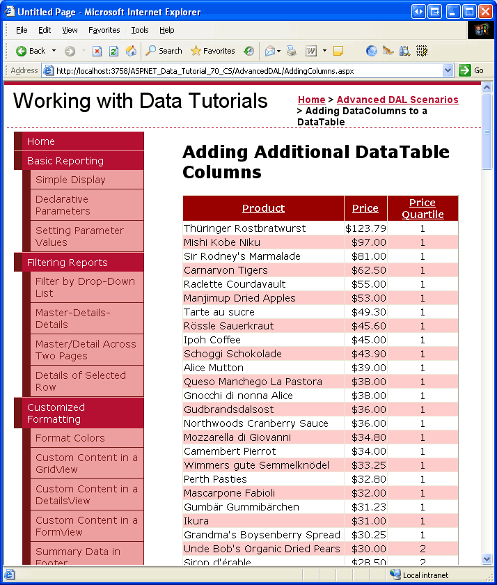 Con alcune righe di codice è possibile aumentare GridView in modo che colori le righe del prodotto in base al relativo PriceQuartile valore. Potremmo colorare quei prodotti nel primo quartile di un verde leggero, quelli nel secondo quartile di un giallo leggero e così via. Ti invito a dedicare un po' di tempo per aggiungere questa funzionalità. Se hai bisogno di un ripasso sulla formattazione di un controllo GridView, consulta l'esercitazione Formattazione personalizzata basata sui dati.