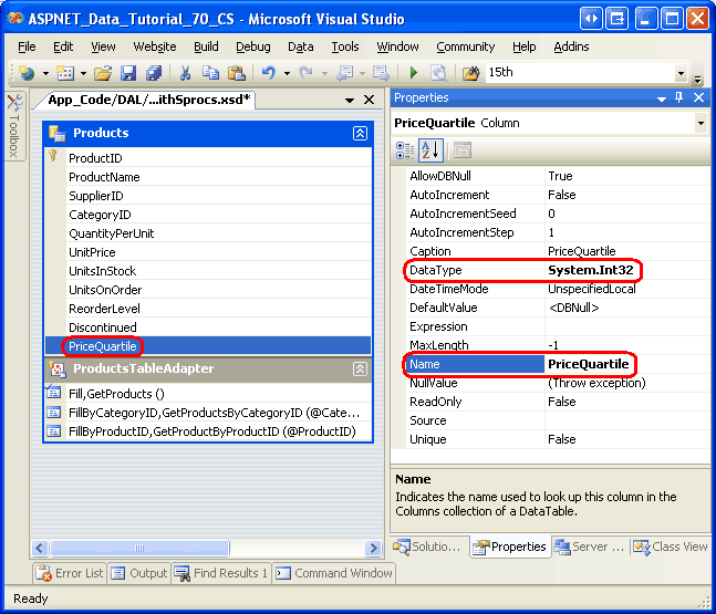 Nella maggior parte degli scenari, tutti i metodi in un oggetto TableAdapter restituiranno lo stesso set di campi dati, ma in alcuni casi potrebbe essere necessario restituire un campo aggiuntivo. Ad esempio, nell'esercitazione Master/Detail Using a Bulleted List of Master Records with a Details DataList è stato aggiunto un metodo al CategoriesTableAdapter che, oltre ai campi dati della query principale, restituiva un campo NumberOfProducts che indicava il numero di prodotti associati a ogni categoria. In questa esercitazione è stato esaminato l'aggiunta di un metodo nell'oggetto ProductsTableAdapter che ha restituito un PriceQuartile campo oltre ai campi dati della query principale. Per acquisire campi dati aggiuntivi restituiti dai metodi di TableAdapter, è necessario aggiungere colonne corrispondenti a DataTable.