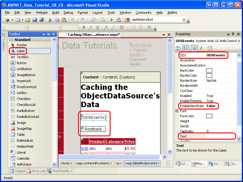 Per apprezzare appieno la frequenza con cui i dati vengono recuperati dal database, è possibile visualizzare un messaggio che indica quando i dati vengono recuperati di nuovo. Aggiungere una etichetta Web di controllo sopra il GridView denominato ODSEvents. Cancellare la Text proprietà e impostarne la EnableViewState proprietà su false. Sotto l'etichetta, aggiungere un controllo Web di tipo pulsante e impostarne la Text proprietà su Postback.