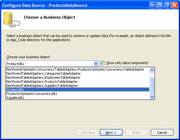 Figura 4: Configurare ObjectDataSource per l'uso della classe (ProductsBLL a dimensione intera)