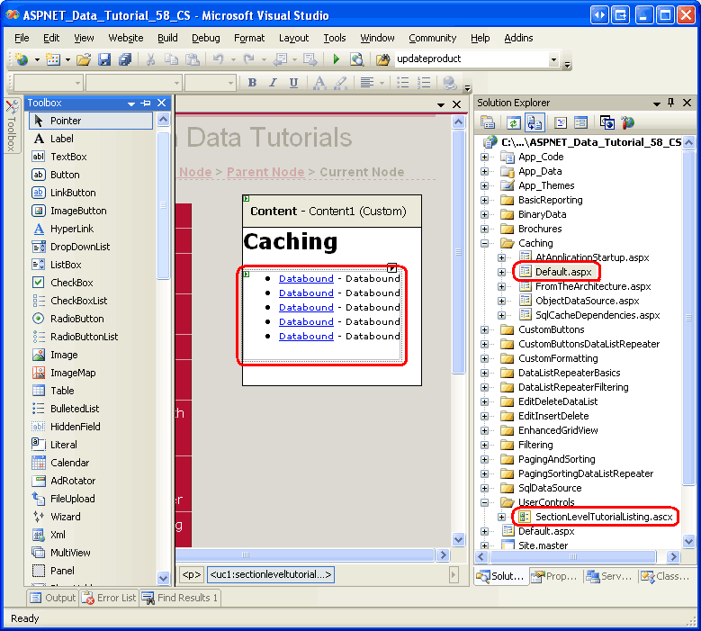 Come nelle altre cartelle, Default.aspx nella cartella Caching elenca le esercitazioni nella relativa sezione. Tenere presente che il SectionLevelTutorialListing.ascx controllo utente fornisce questa funzionalità. Aggiungere quindi questo controllo utente a Default.aspx trascinandolo da Esplora soluzioni nella visualizzazione di progettazione della pagina.