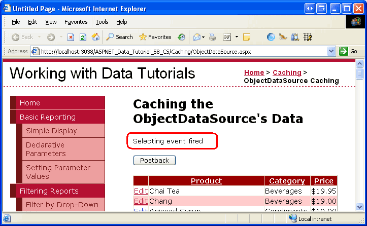 Salvare le modifiche e rivedere questa pagina in un browser. Il testo generato dall'evento Selecting verrà visualizzato quando si visita la pagina, perché inizialmente i dati non si trovano nella cache. Tuttavia, i postback successivi attivati facendo clic sul pulsante Postback, durante l'ordinamento, paging o facendo clic sui pulsanti Modifica o Annulla non mostrano nuovamente il testo visualizzato dall'evento Selecting. Questo avviene perché l'evento Selecting viene generato solo quando ObjectDataSource ottiene i dati dall'oggetto sottostante. L'evento Selecting non viene generato se i dati vengono estratti dalla cache dei dati.