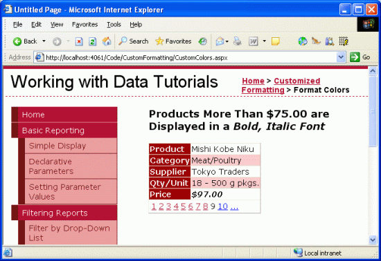 In molti scenari, tuttavia, i requisiti di formattazione dipendono dal valore dei dati visualizzati. Ad esempio, per attirare l'attenzione sui prodotti esauriti, un report che elenca le informazioni sul prodotto potrebbe impostare il colore di sfondo su giallo per i prodotti i cui UnitsInStock campi e UnitsOnOrder sono entrambi uguali a 0. Per evidenziare i prodotti più costosi, potremmo voler visualizzare i prezzi di tali prodotti che costano più di $ 75,00 in un carattere in grassetto.