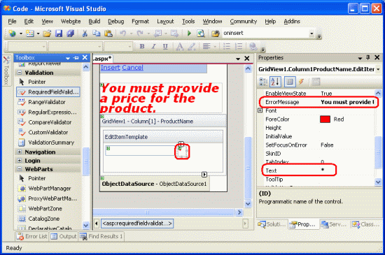 Figura 7: Configura le proprietà di RequiredFieldValidator ControlToValidate, ErrorMessage, e Text (fare clic per visualizzare l'immagine a dimensione intera)