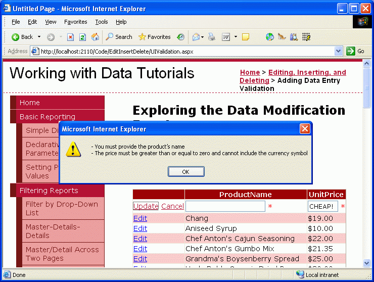 EditItemTemplate non include un RequiredFieldValidator, consentendo al postback di eseguire l'esecuzione e la logica di aggiornamento per iniziare. Tuttavia, il gestore eventi RowUpdating copiato dall'esercitazione Analisi degli eventi associati all'inserimento, all'aggiornamento e all'eliminazione include un controllo a livello di codice che garantisce che UnitPrice venga fornito. È possibile rimuovere questa logica, lasciarla così com'è o aggiungere un RequiredFieldValidator a UnitPriceEditItemTemplate.