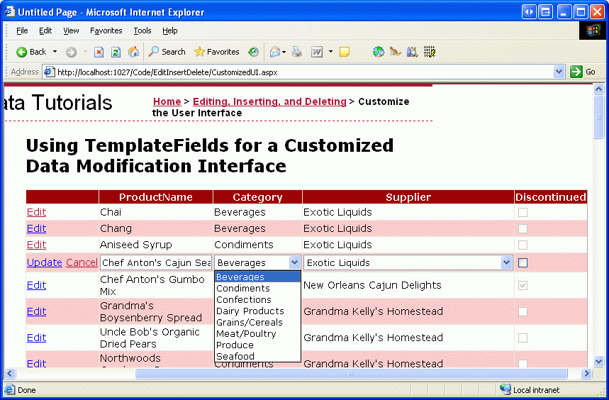 Per fornire questo comportamento, è necessario convertire i SupplierNameCategoryName BoundFields nei TemplateFields il cui ItemTemplate emette i valori SupplierName e CategoryName e il cui EditItemTemplate usa un controllo DropDownList per elencare le categorie e i fornitori disponibili.