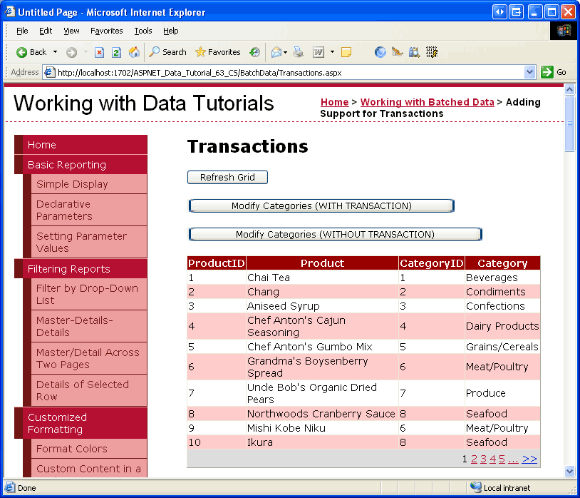 Il secondo gestore eventi riassegna i prodotti CategoryID e usa il nuovo metodo di transazione da BLL per eseguire gli aggiornamenti del database sotto l'ambito di una transazione. Si noti che il valore di CategoryID di ciascun prodotto è impostato arbitrariamente sullo stesso valore di ProductID. Questo funzionerà bene per i primi alcuni prodotti, poiché quei prodotti hanno valori ProductID che si mappano casualmente a CategoryID validi. Ma quando gli elementi ProductID diventano troppo grandi, questa sovrapposizione coincidente di ProductID e CategoryID non si applica più.