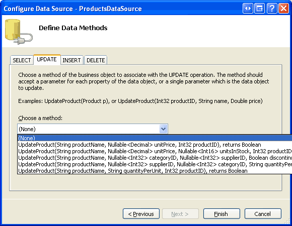 Questi metodi non includono l'attributo DataObjectMethodAttribute assegnato alla maggior parte degli altri metodi nella ProductsBLL classe perché richiameremo questi metodi direttamente dalle classi code-behind delle pagine di ASP.NET. Tenere presente che DataObjectMethodAttribute viene usato per contrassegnare i metodi da visualizzare nella procedura guidata Configura origine dati di ObjectDataSource e in quale scheda (SELECT, UPDATE, INSERT o DELETE). Poiché GridView non dispone di qualsiasi supporto predefinito per la modifica o l'eliminazione in batch, è necessario richiamare questi metodi a livello di codice anziché usare l'approccio dichiarativo senza codice.
