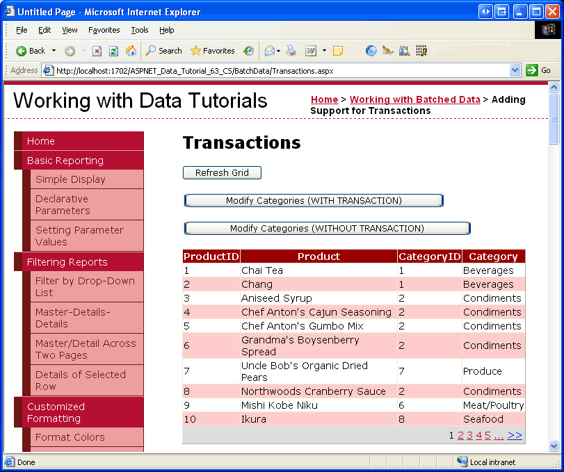 Il secondo gestore eventi riassegna i prodotti CategoryID e usa il nuovo metodo di transazione da BLL per eseguire gli aggiornamenti del database sotto l'ambito di una transazione. Si noti che il valore di CategoryID di ciascun prodotto è impostato arbitrariamente sullo stesso valore di ProductID. Questo funzionerà bene per i primi alcuni prodotti, poiché quei prodotti hanno valori ProductID che si mappano casualmente a CategoryID validi. Ma quando gli elementi ProductID diventano troppo grandi, questa sovrapposizione coincidente di ProductID e CategoryID non si applica più.