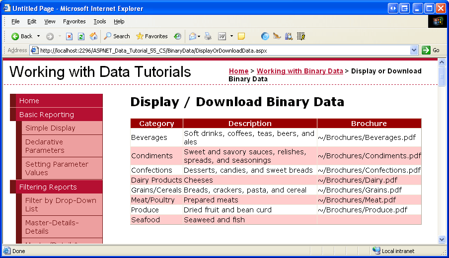 Visualizzare questa pagina tramite un browser (vedere la figura 5). Ognuna delle otto categorie è elencata. Le sette categorie con BrochurePath valori hanno il BrochurePath valore visualizzato nel rispettivo BoundField. Frutti di mare, che ha un NULL valore per il relativo BrochurePath, visualizza una cella vuota.