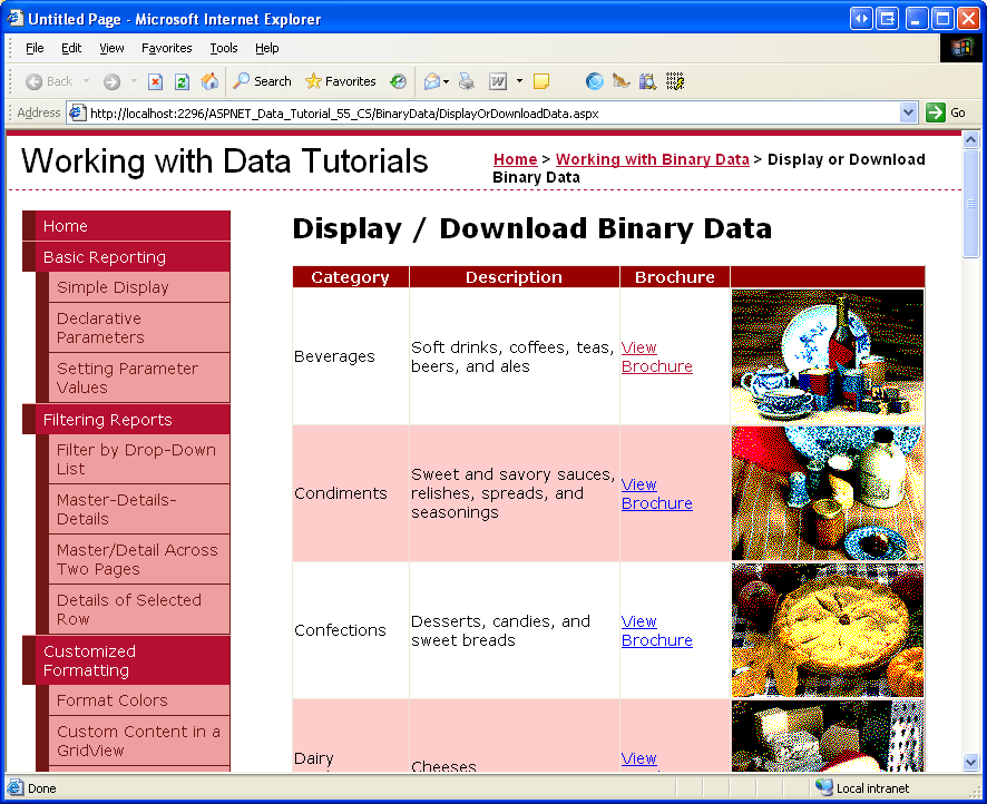 In questa esercitazione è stato esaminato come presentare i dati binari. La modalità di presentazione dei dati dipende dal tipo di dati. Per i file di brochure PDF, abbiamo offerto all'utente un collegamento View Brochure che, quando si fa clic, ha portato l'utente direttamente al file PDF. Per l'immagine della categoria, abbiamo prima creato una pagina per recuperare e restituire i dati binari dal database; successivamente, tale pagina è stata utilizzata per visualizzare l'immagine di ciascuna categoria in un controllo GridView.