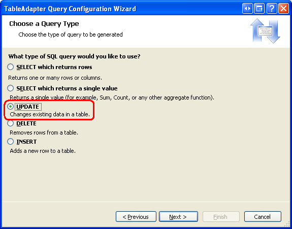 Aprire il set di dati tipizzato e, da Progettazione, fare clic con il pulsante destro del mouse sull'intestazione CategoriesTableAdapter s e scegliere Aggiungi query dal menu di scelta rapida per avviare la Configurazione guidata query TableAdapter. Questa procedura guidata inizia chiedendo in che modo la query TableAdapter deve accedere al database. Scegliere Usa istruzioni SQL e fare clic su Avanti. Il passaggio successivo richiede la generazione del tipo di query. Poiché si sta creando una query per aggiungere un nuovo record alla Categories tabella, scegliere AGGIORNA e fare clic su Avanti.
