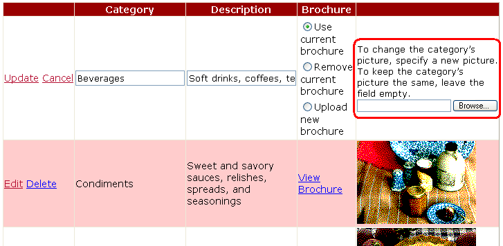 L'interfaccia di modifica di Picture ImageField viene visualizzata come una casella di testo che appare popolata con il valore della sua proprietà DataImageUrlField. Durante il flusso di lavoro di modifica, GridView passa un parametro a ObjectDataSource con il nome del parametro il valore della proprietà ImageField s DataImageUrlField e il valore del parametro immesso nella casella di testo nell'interfaccia di modifica. Questo comportamento è adatto quando l'immagine viene salvata come file nel file system e DataImageUrlField contiene l'URL completo dell'immagine. In tali circostanze, l'interfaccia di modifica visualizza l'URL dell'immagine nella casella di testo, che l'utente può modificare e aver salvato di nuovo nel database. Concessa, questa interfaccia predefinita non consente all'utente di caricare una nuova immagine, ma consente di modificare l'URL dell'immagine dal valore corrente a un altro. Per questa esercitazione, tuttavia, l'interfaccia di modifica predefinita di ImageField non è sufficiente perché i Picture dati binari vengono archiviati direttamente nel database e la DataImageUrlField proprietà contiene solo .CategoryID