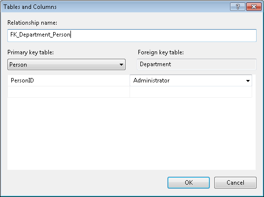 Fare clic su OK nella casella Tabelle e colonne , fare clic su Chiudi nella casella Relazioni chiave esterna e salvare le modifiche. Se viene chiesto se si desidera salvare le Person tabelle e Department fare clic su Sì.