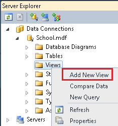 In Esplora server espandere School.mdf, fare clic con il pulsante destro del mouse sulla cartella Visualizzazioni e scegliere Aggiungi nuova visualizzazione.