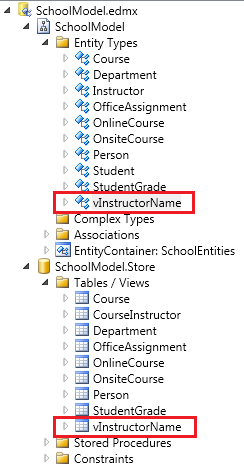 Quando si fa riferimento alla nuova vInstructorName entità nel codice, non si vuole usare la convenzione di database di anteporre un prefisso "v" in lettere minuscole. Di conseguenza, si rinominano l'entità e il set di entità nel modello.